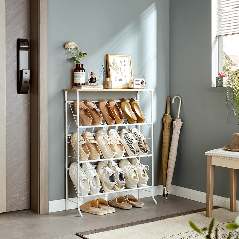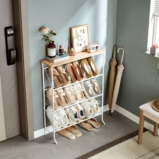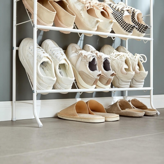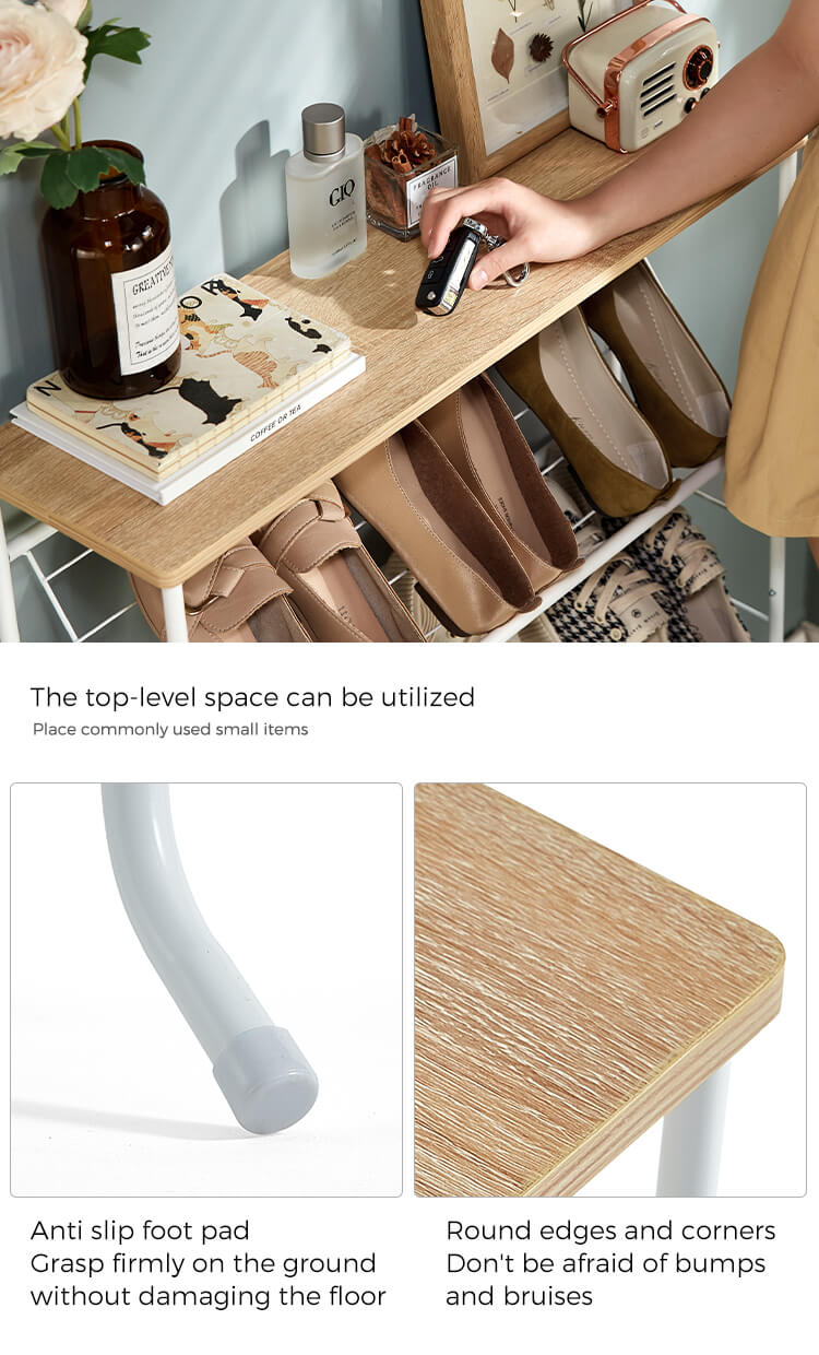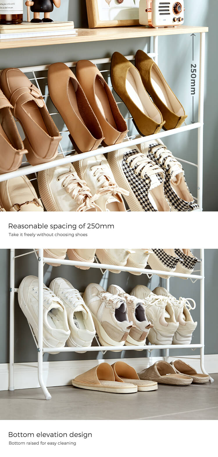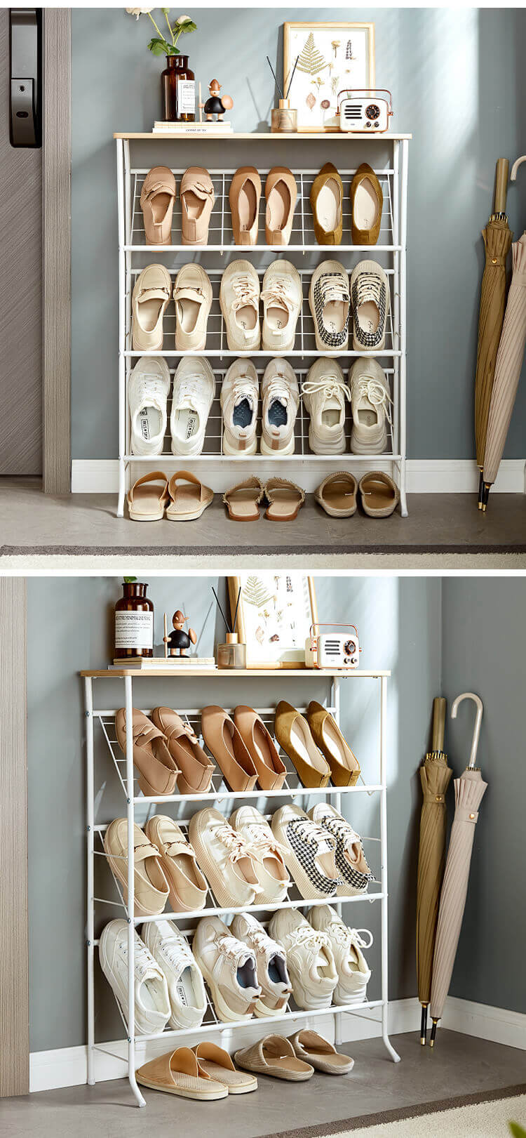 This upgraded to a double-row steel tube shoe rack, which provides more space to accommodate shoes,boots etc, but also bags, umbrellas, and books. This shoe rack has a simple design to suit any home decoration and bring a modern touch to your space.