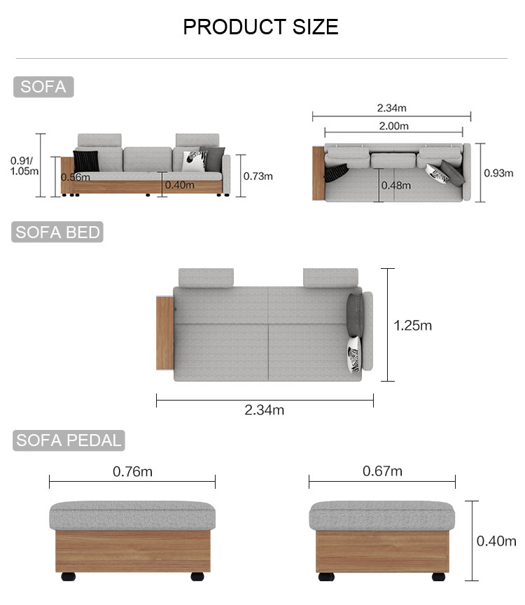Sofa: 234*93*105 cm + Ottoman: 76*67*40 cm Parallel placement(Sofa bed):234*125*73 cm |