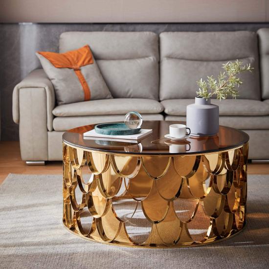 Linsy Luxury Stainless Steel Mirrored Golden Round Large Big Glass Top Coffee Table Set YP1462