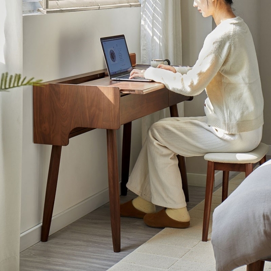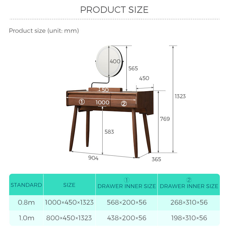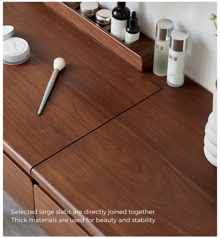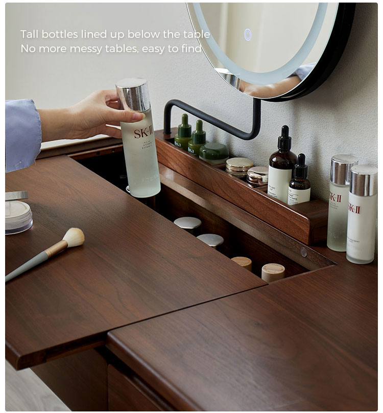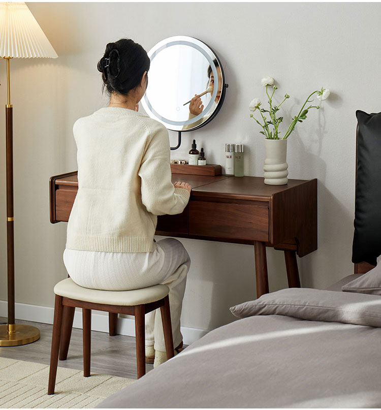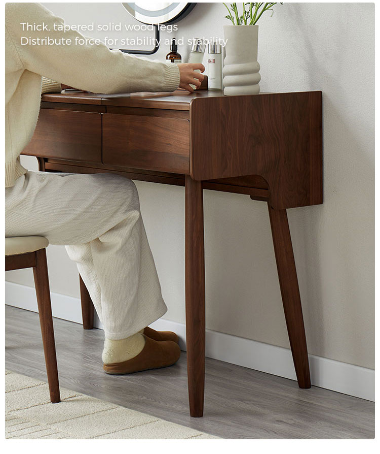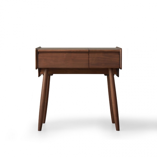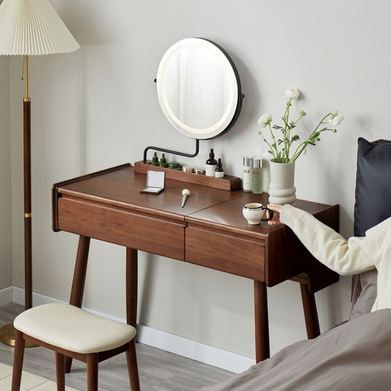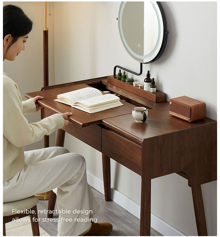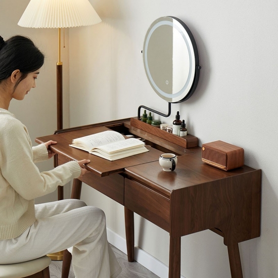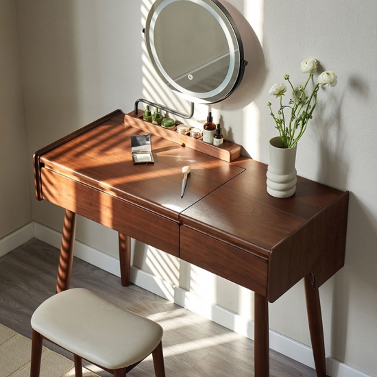 Crafted in rich walnut finish, this 0.8-meter dressing table combines elegance and practicality. The desktop offers flexible space for makeup, work, or study, easily transforming into a compact writing desk. Designed with generous storage—including drawers and organizers—it keeps beauty essentials and daily items neatly arranged. The integrated tilt-adjustable mirror ensures optimal lighting and clarity. Ideal for modern living spaces, it maximizes functionality without compromising style.