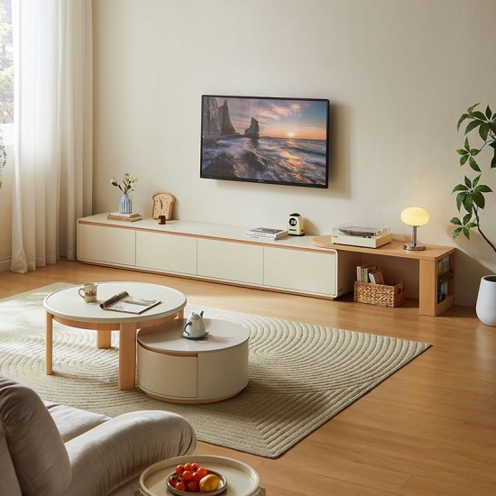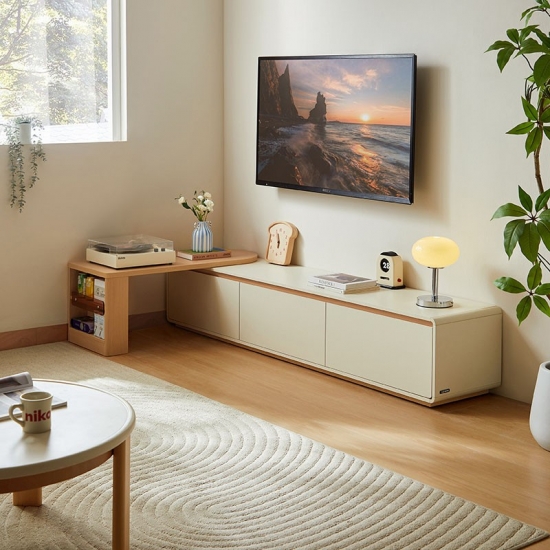 Designed for modern living, this LINSY white TV console features a smart, modular design that extends to accommodate your space and screen size. Crafted with clean lines and a durable white finish, it seamlessly blends minimalism with functionality.