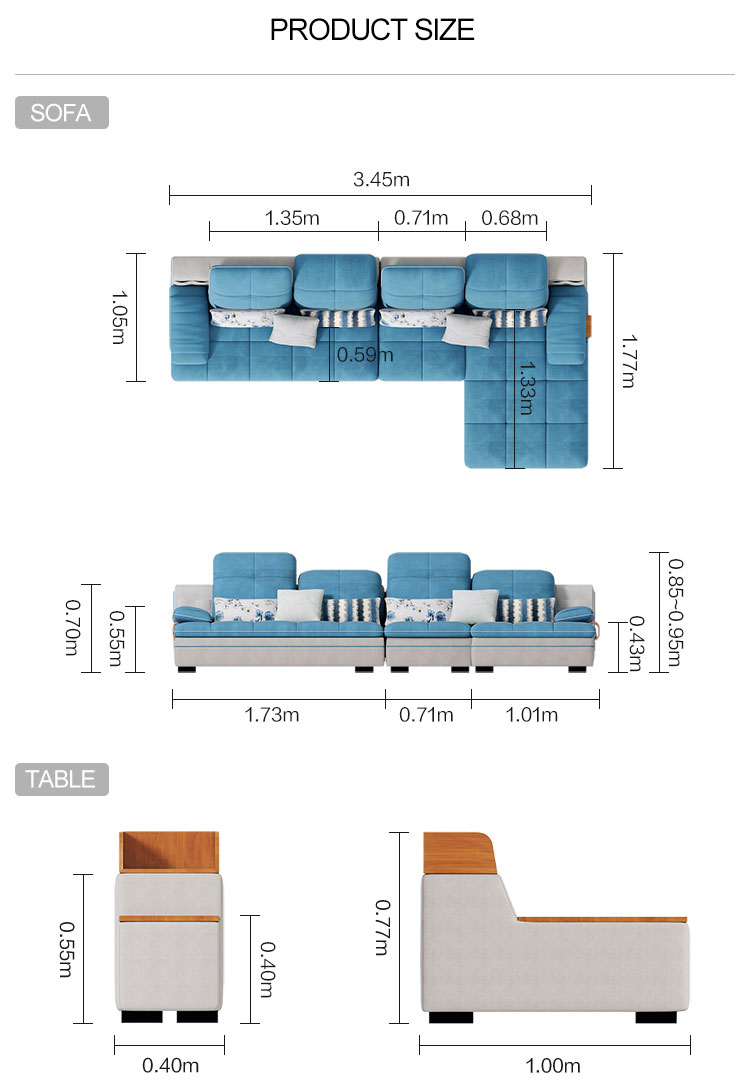 Single seat: 71*105*85-95 cm Three seat: 173*105*85-95 cm Chaise: 177*101*85-95 cm Side table: 40*100*77 cm |