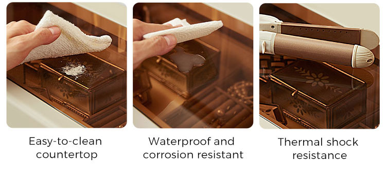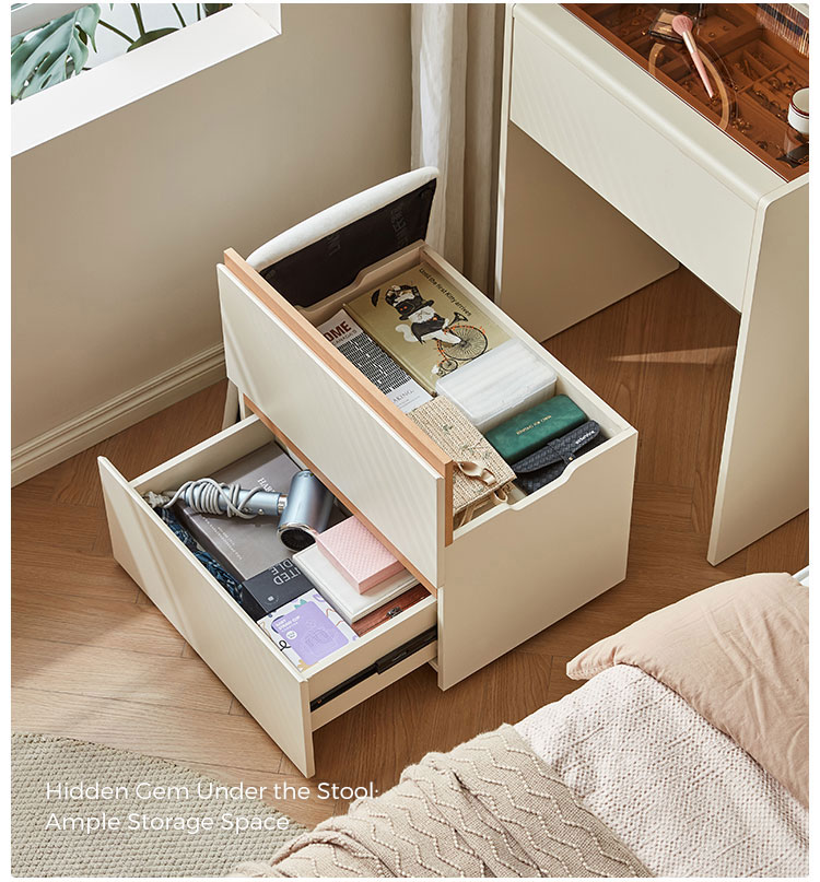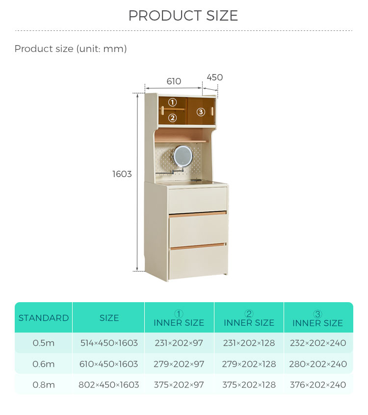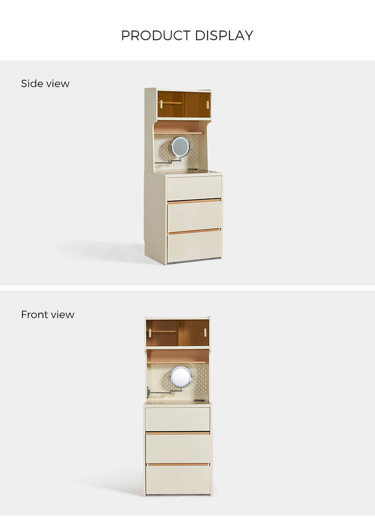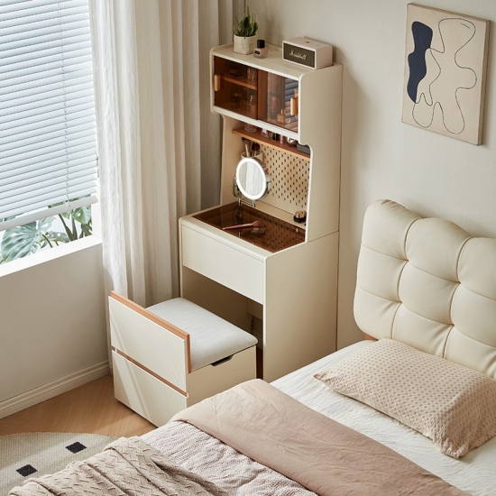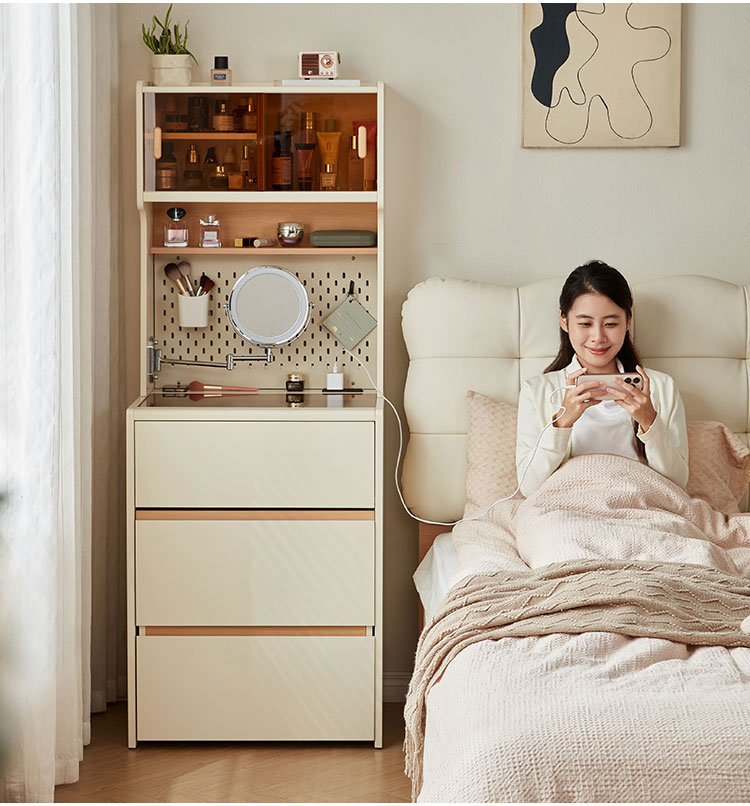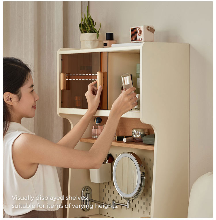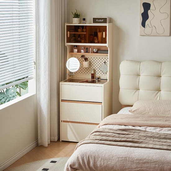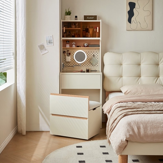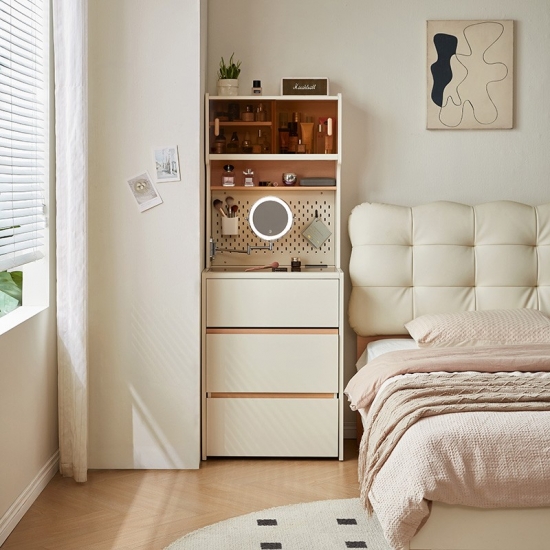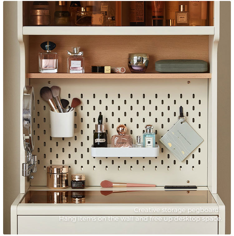 This space-saving 0.6-meter vanity seamlessly combines a sleek dressing table with a high cabinet into one unified, modern piece. Finished in a clean white, its minimalist design features an integrated perforated board (pegboard) back panel. This smart addition unlocks superior organization—use hooks, shelves, and accessories to keep makeup tools, skincare items, and accessories neatly arranged and instantly within reach.
