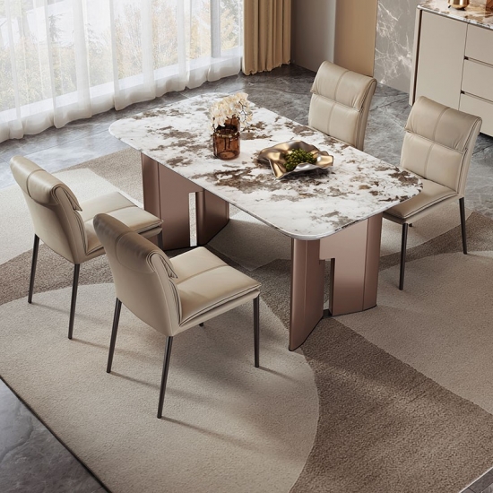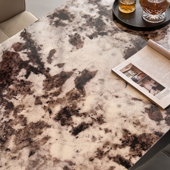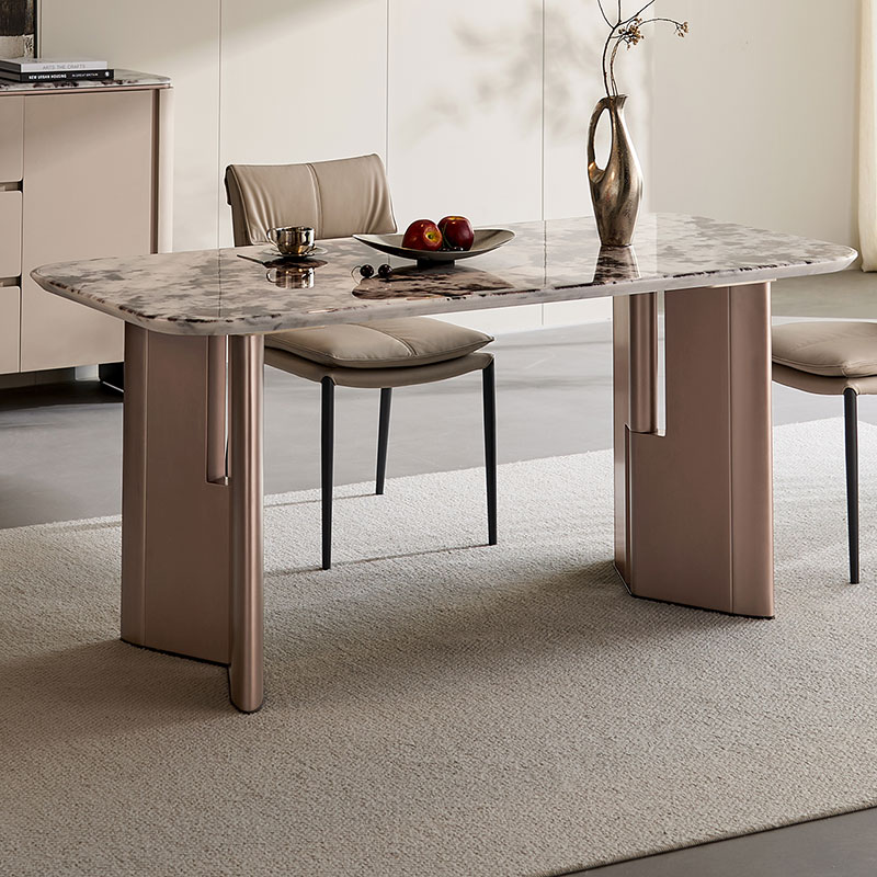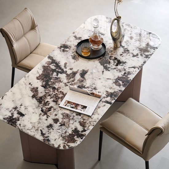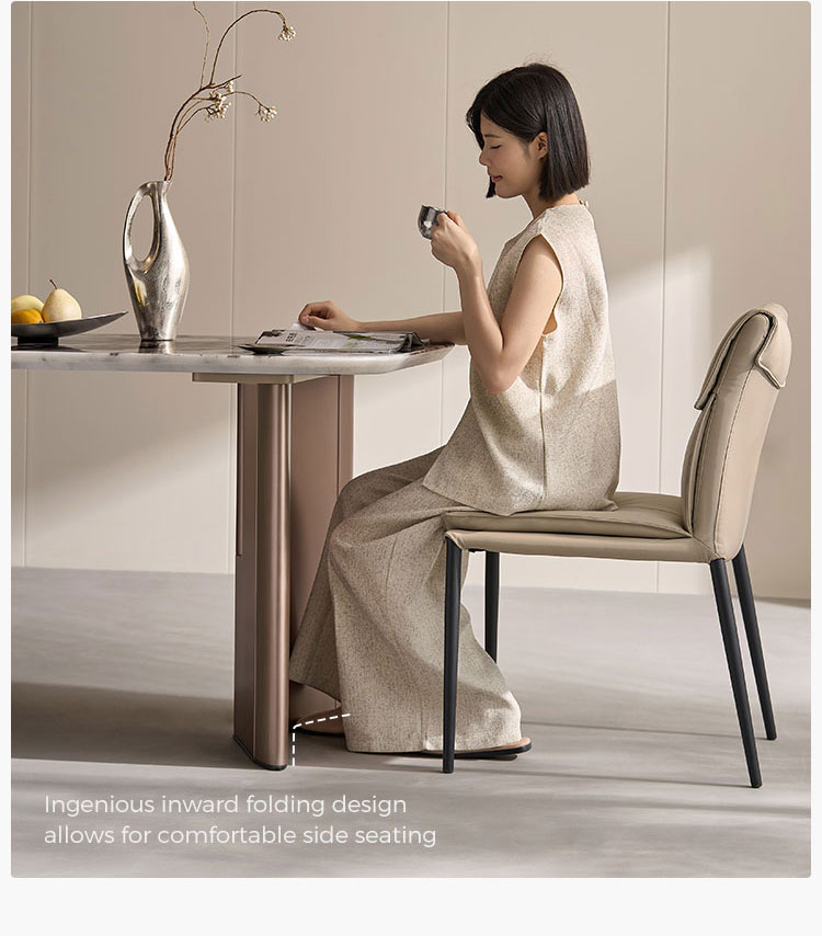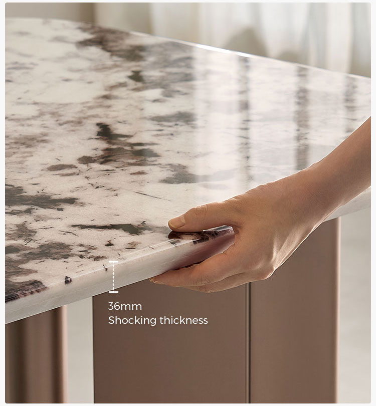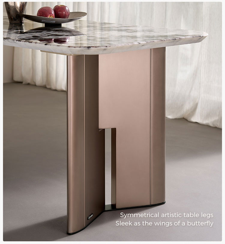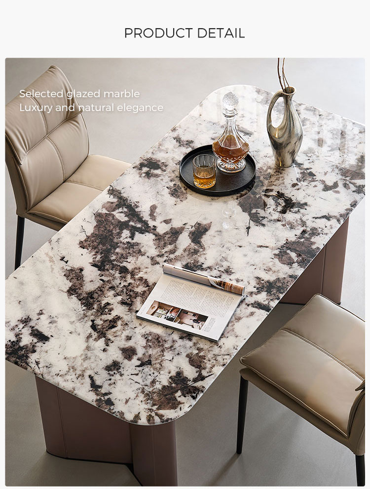Elevate your dining experience with LINSY Modern Marble Dining Table. Expertly crafted with a sleek rectangular top cut from a single slab of natural marble, this table is a stunning centerpiece for any contemporary home. Each piece boasts unique, organic veining, ensuring your table is one-of-a-kind.