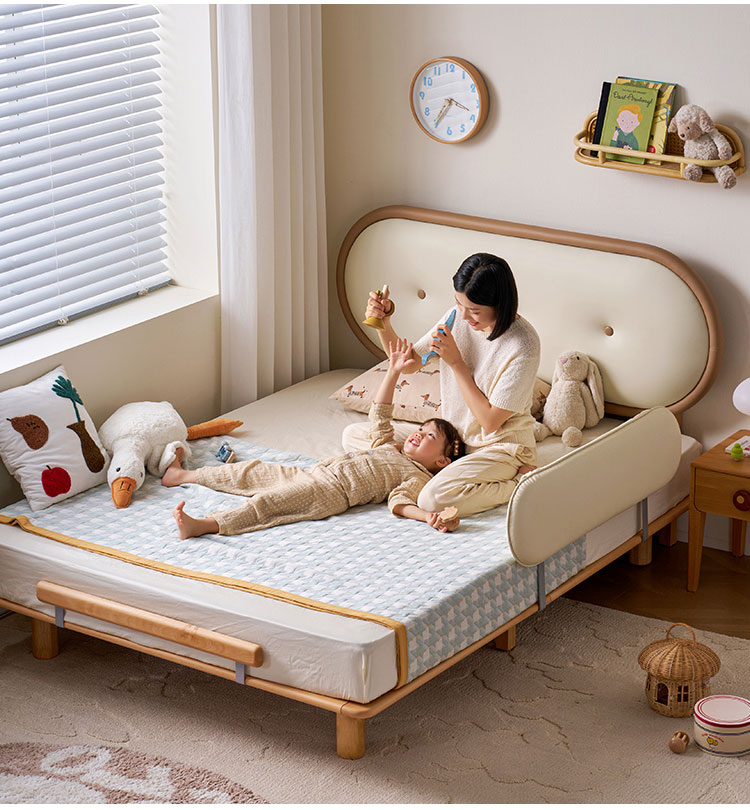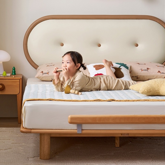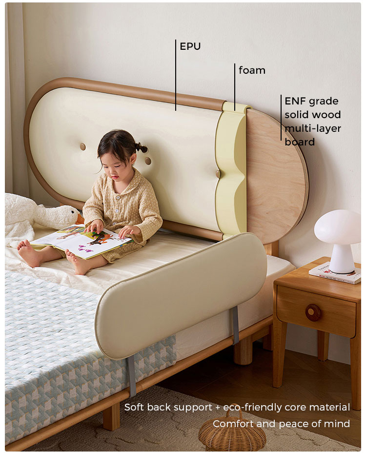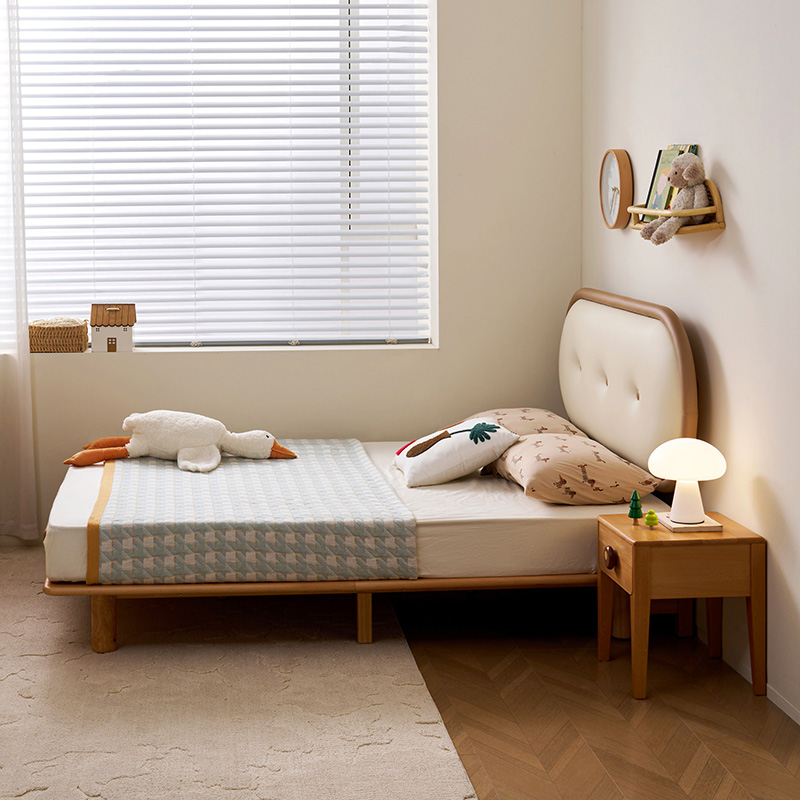 Introducing our beautifully designed kids bed, crafted to create a cozy and modern sleep space for your little one. Featuring a soft white leather headboard and a sturdy solid wood frame, this bed combines safety, style, and functionality. Its clean lines and contemporary look make it a perfect fit for any bedroom decor.