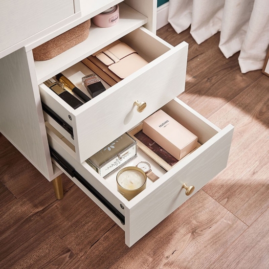 Wipe clean with a soft, dry cloth. To protect the finish, avoid the use of chemicals and household cleaners. Hardware may loosen over time. Periodically check that all connections are tight. 5 Drawers would be enough for you to pack the secrets of beauty, skincare products, beauty equipment, and goods of varied sizes, and arrange a boarding house for them.