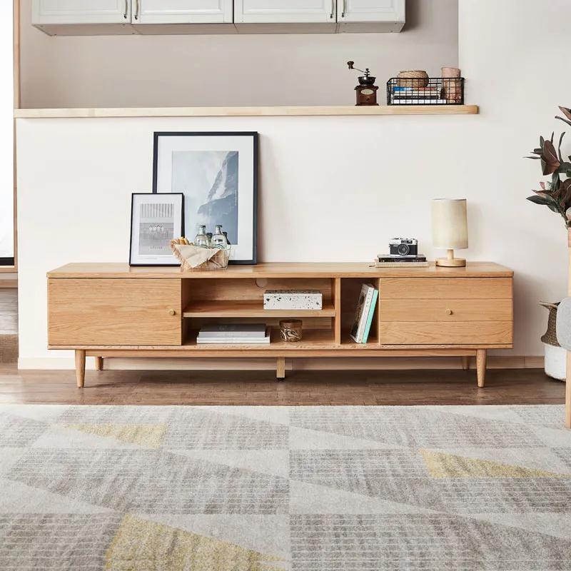 The coffee table + TV cabinet of natural wood color and fabric sofa are gold combination in Nordic style. Natural coffee table with simple design, delicate leg and fluent desktop line, placed in living room is feast for eyes, even it is only a simple table.