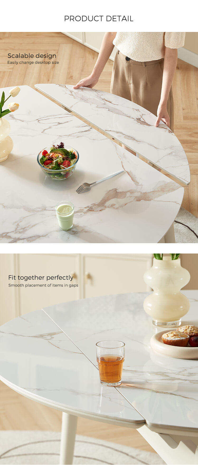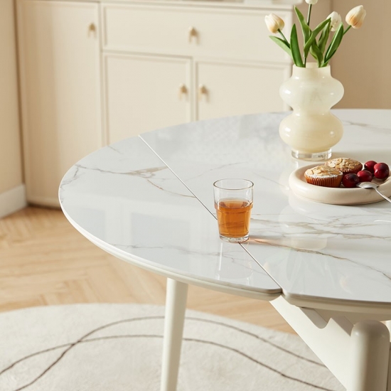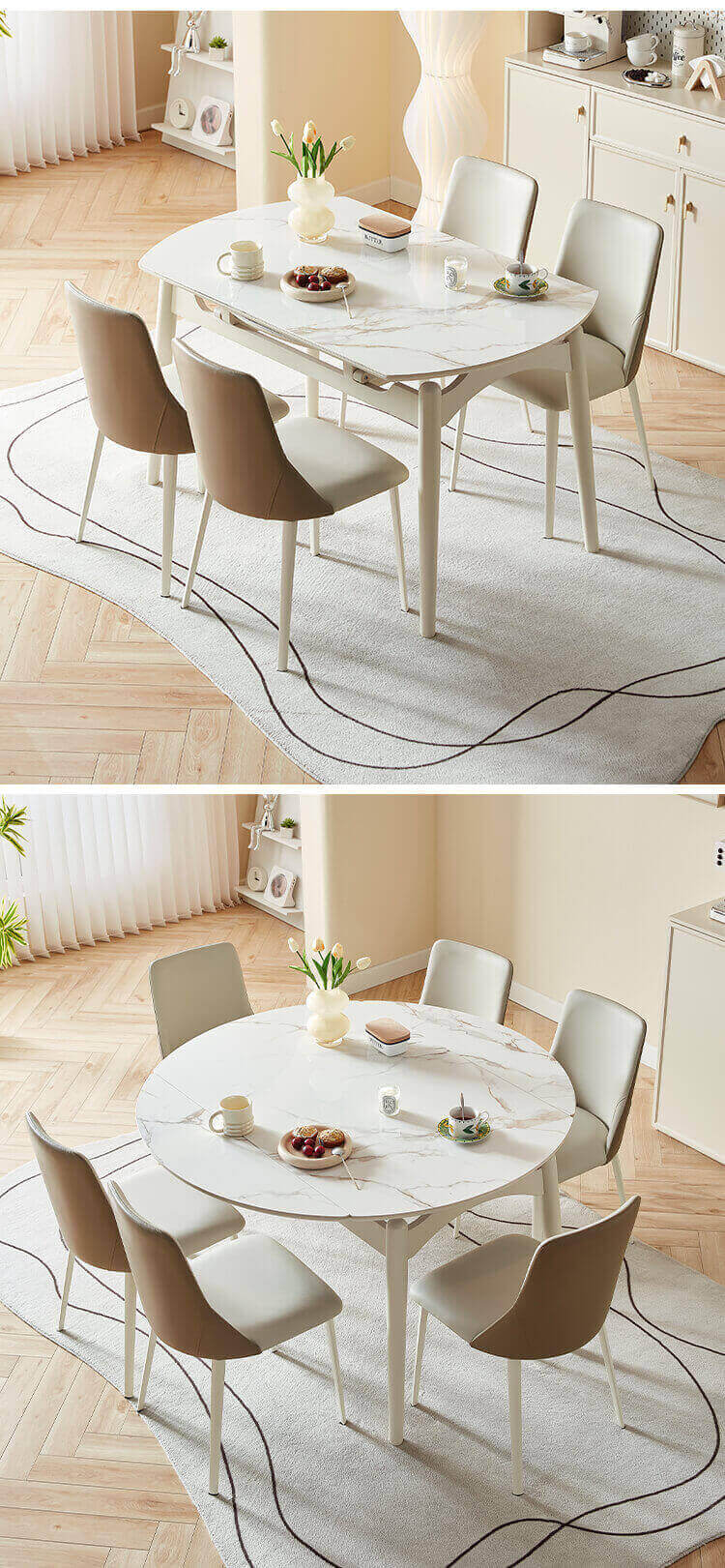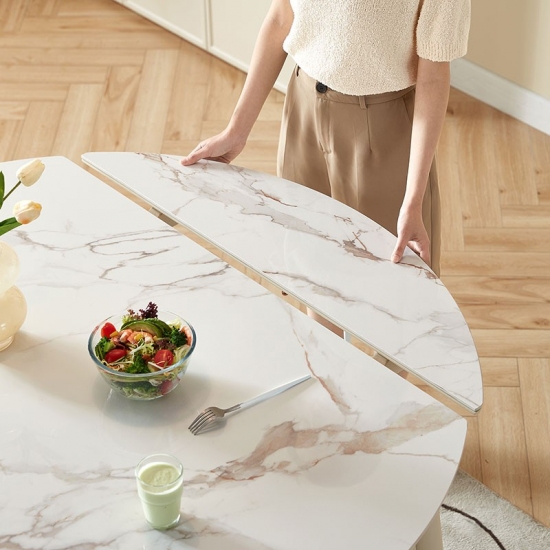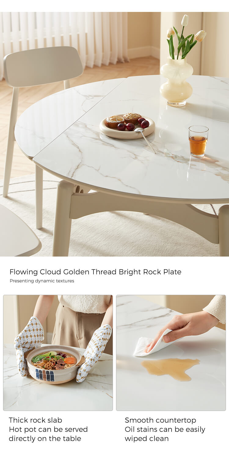 The dining table set with matte textured rock slabs allow you to enjoy the taste and style at the same time. The natural and smooth texture combined with the matte treatment highlights the elegant charm and makes dining more ceremonial. This table can be adjust easily to afford more people for dinner.
