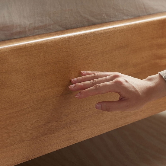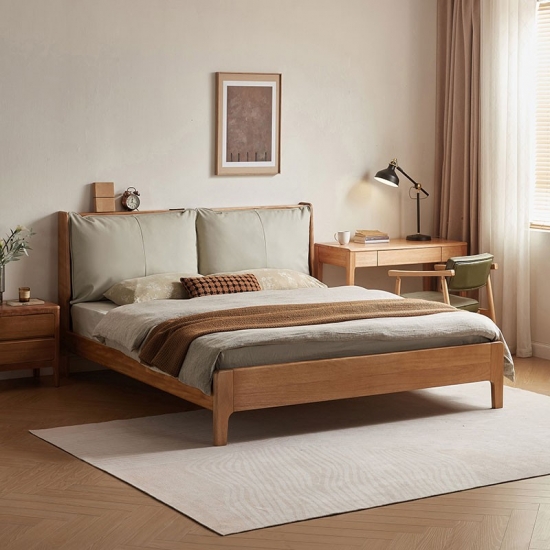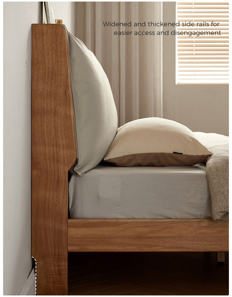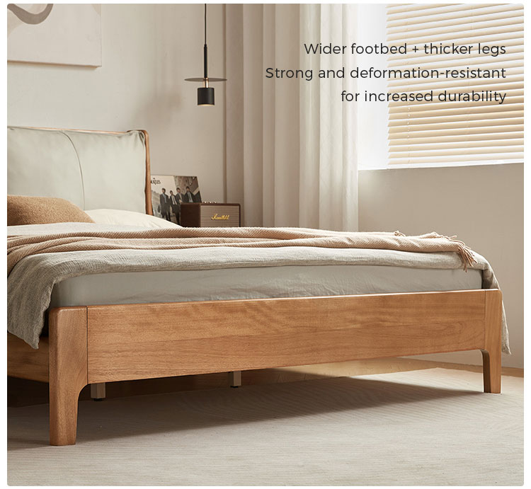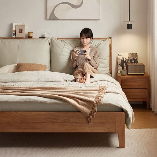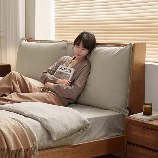 Elevate your sanctuary with LINSY artisan-crafted bed featuring a warm walnut-finished solid wood frame and top-grain leather upholstery. The hand-rubbed wood grain showcases natural variations, while the deep espresso-toned leather develops a luxurious patina over time.